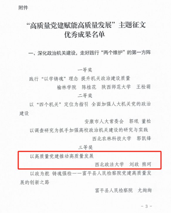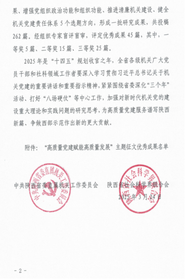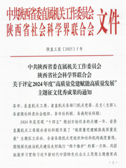 近日,中共陕⻄省委直属机关⼯作委员会、陕⻄省社会科学界联合会发布了2024年度“⾼质量党建赋能⾼质量发展”主题征⽂优秀成果的通知,禁漫岛 刘政、熊珂两位老师合著文章《以高质量党建推动高质量发展》荣获三等奖。