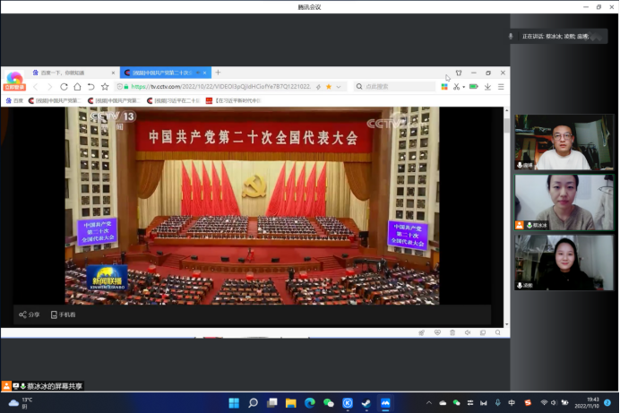 党支部书记蔡冰冰领学习近平总书记在中国共产党第二十次全国代表大会上的报告,集体观看了中国共产党第二十次全国代表大会闭幕会、中国共产党第二十届中央委员会第一次全体会议公报、中国共产党第二十届中央政治局常委同中外记者见面会等相关新闻视频。
