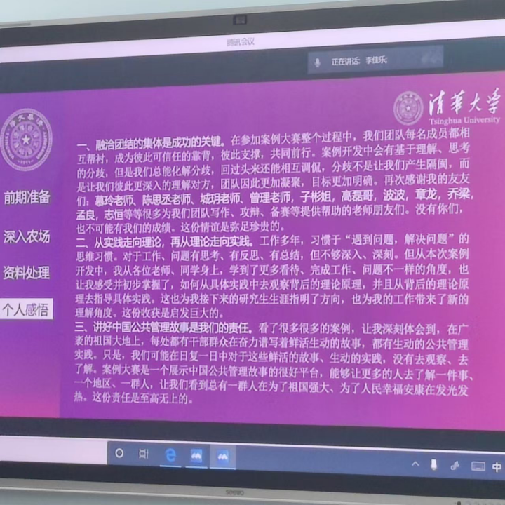辅导课特别邀请了第八届全国MPA公共管理案例大赛一等奖和最佳参赛文本奖获得者——清华大学2023级MPA 研究生李佳乐及我校获得大赛佳绩的参赛小组代表——2023级行政管理专业研究生王莉、杨雨欣分享参赛经验和感悟,介绍参赛选题、报告撰写及报名注册、提交报告等关键问题和注意事项等。三位同学各有侧重,系统分享了案例大赛参赛各环节遇到的挑战和解决办法,表达了案例大赛不仅让参赛队员收获了深厚的“战友情”,更提高了写作水平、思考能力,拓宽了视野,提升了综合素质,是学业生涯中难忘的宝贵经历。