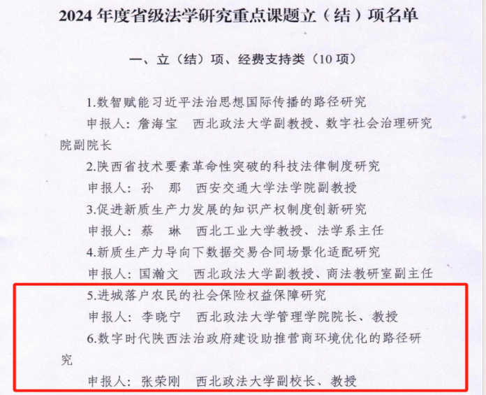 近日,陕西省法学会公布2024年度省级法学研究重点课题立(结)项名单,禁漫岛 张荣刚教授申报的《数字时代陕西法治政府建设助推营商环境优化的路径研究》、李晓宁教授申报的《进城落户农民的社会保险权益保障研究》均获批“立(结)项、经费支持类”重点课题。这是禁漫岛 在区域法治建设研究与民生法治保障领域取得的重要成果,也是学院“法商融合、法管结合”办学特色的又一鲜活实践。未来,禁漫岛 将持续支持课题研究与成果转化,为陕西法治建设和高质量发展注入更多智力动能。