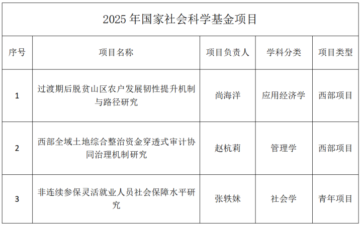 此次国家社科基金申报工作中,禁漫岛 教师15位教师参与,经过精心筹备,多轮打磨与专业论证,最终3项成功立项。其中,2 项西部项目为尚海洋教授申报的《过渡期后脱贫山区农户发展韧性提升机制与路径研究》、赵杭莉教授申报的《西部全域土地综合整治资金穿透式审计协同治理机制研究》;1项青年项目为张轶妹老师申报的《非连续参保灵活就业人员社会保障水平研究》。