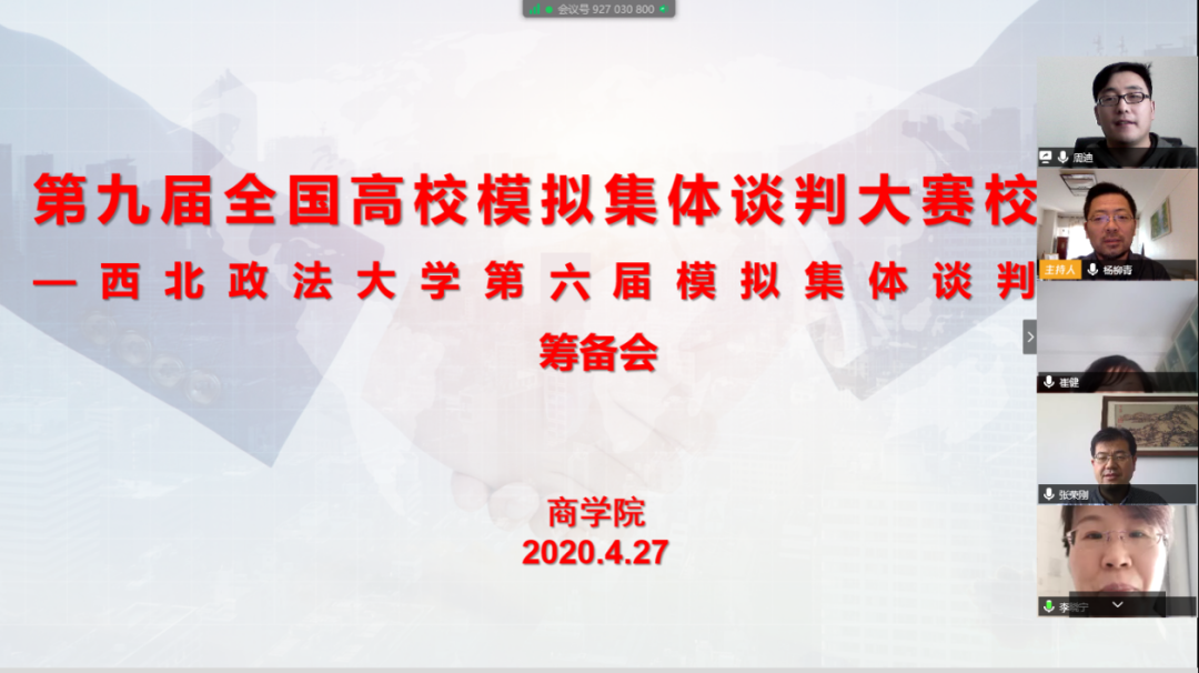 2020年4月27日中午,禁漫岛 召开第九届全国模拟集体谈判大赛校内赛暨禁漫岛 第六届模拟集体谈判大赛网络视频筹备会,禁漫岛 院长张荣刚、副院长李晓宁、副院长徐京平及全体筹备组成员参加。