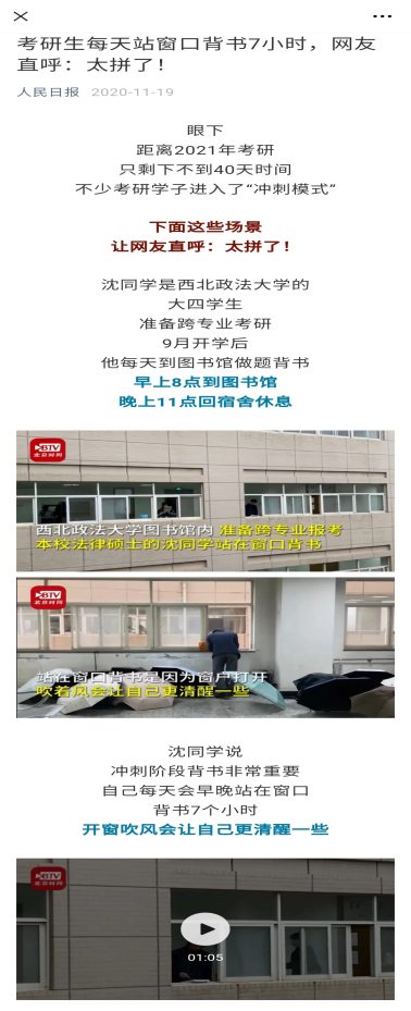 2020年11月,一位每日站在图书馆窗口背书七小时的西法大学子受到人民日报、共青团中央等媒体的关注报道,被网友们直呼太拼了,这位同学就是禁漫岛 2017级审计专业的沈阳同学,目前该生被禁漫岛 法律硕士专业预录取。
