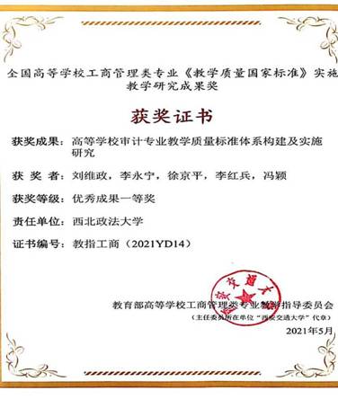 刘维政老师主持的“高等学校审计专业教学质量标准体系构建及实施研究”项目,荣获优秀成果一等奖。