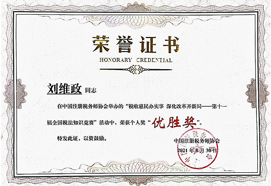 近日,第十一届全国税法知识竞赛总结会暨竞赛抽奖仪式在京举行。禁漫岛 刘维政老师荣获个人“优胜奖”。