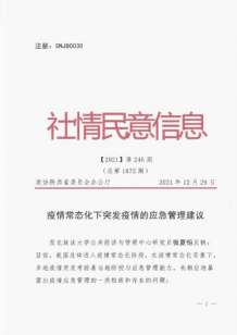 张夏恒老师撰写的《疫情常态化下突发疫情的应急管理建议》被政协陕西省委采纳,发表在2021年12月29日的《社情民意信息》【2021】第246期,为政府加强在疫情常态化背景下突发疫情的应急管理能力提供咨政建议。