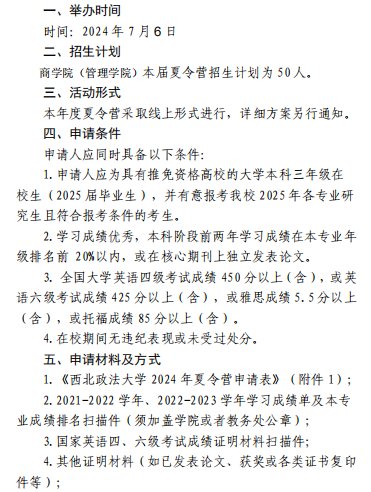 我校今年将举办第五届暑期夏令营。本夏令营旨在进一步促进全国各高校优秀大学生之间的交流互动,传播我校法科研究生教育基本理念,选拔优秀大学生到我校继续深造,欢迎广大优秀学子参与。