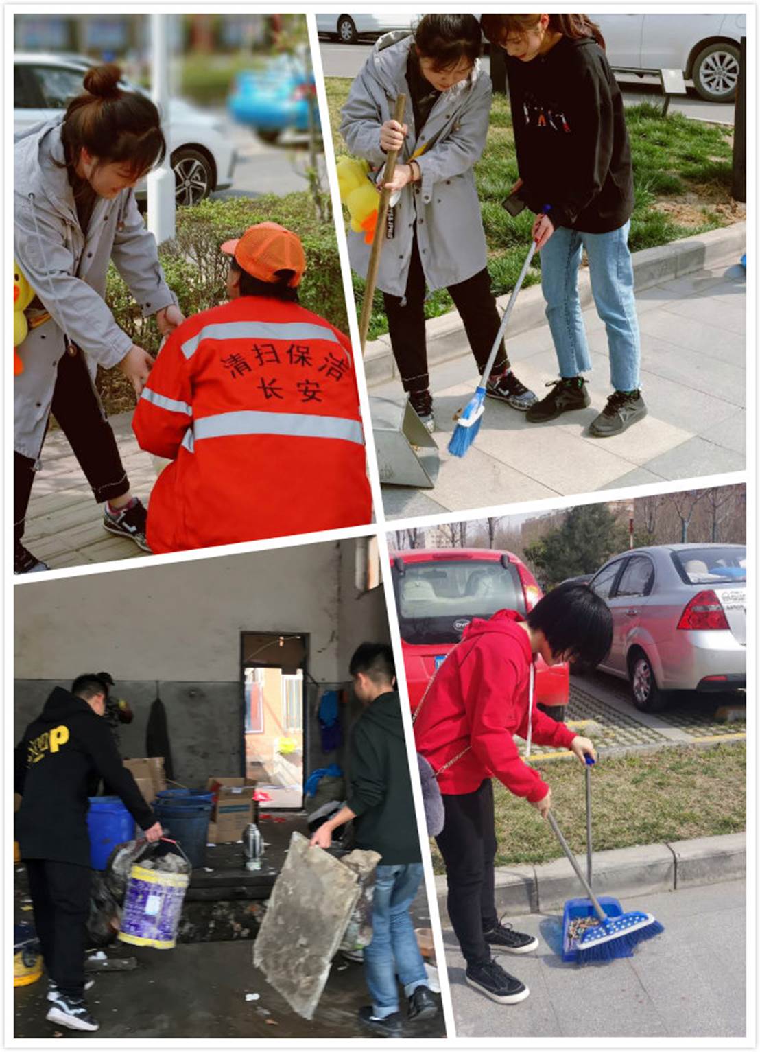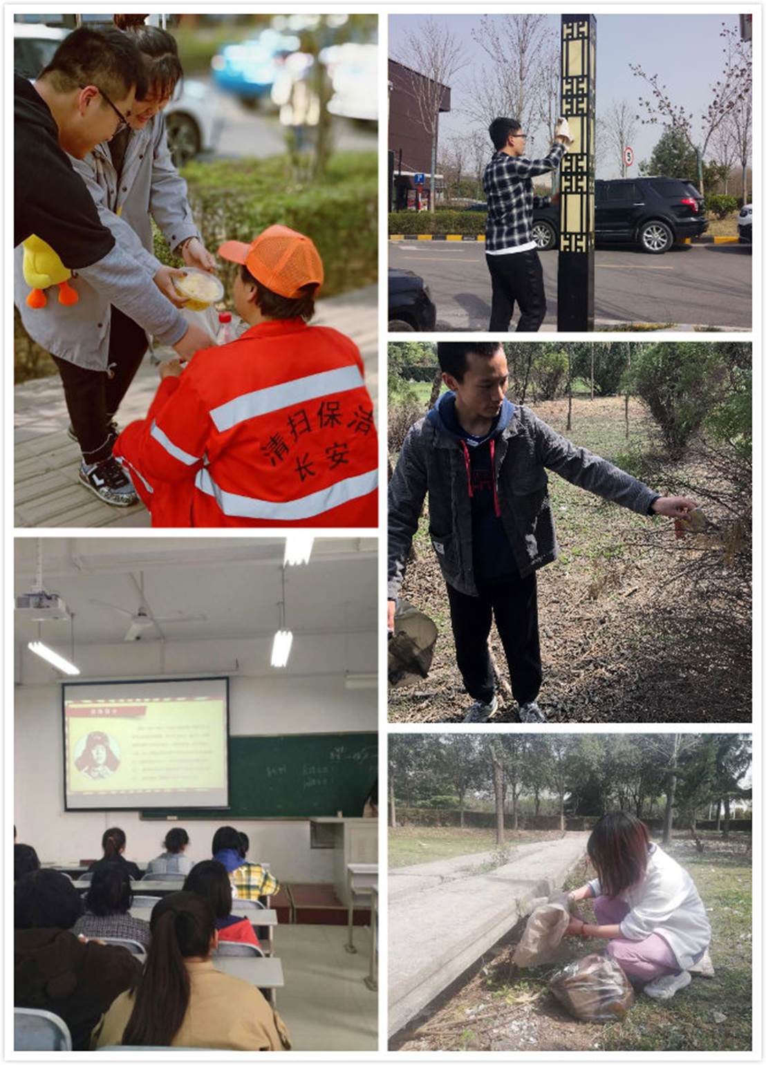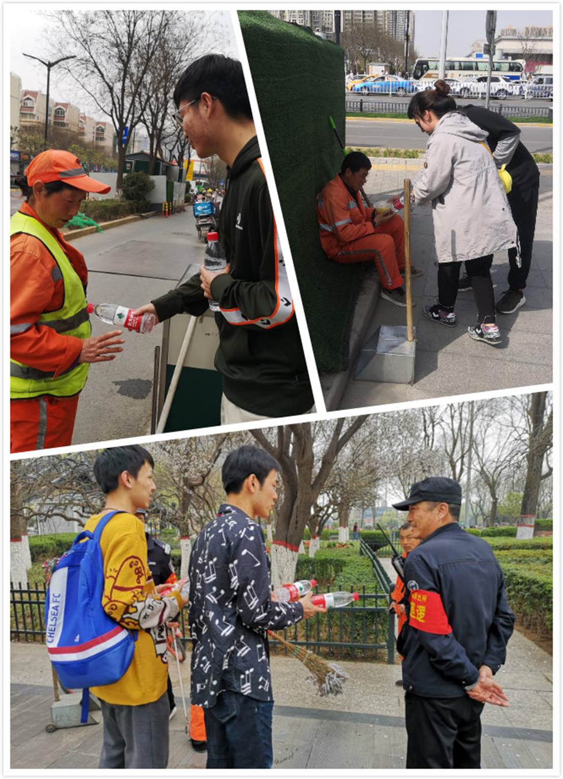 2016级七班利用课余时间,走进城市的化妆师——环卫工人,在与环卫工人的交谈中,切身体会到环卫工人的不易;2018级二班来到府东一路,帮助环卫工人清扫地面垃圾,用自带抹布去擦拭路边垃圾桶、灯柱等;2017级七班以分享雷锋故事、传唱经典歌曲为契机,营造人人学雷锋的良好氛围;2018级一班集体清理校园绿化带、树林里的白色垃圾,亲手维护樱花树林卫生,为校园最美丽的季节增添温暖。