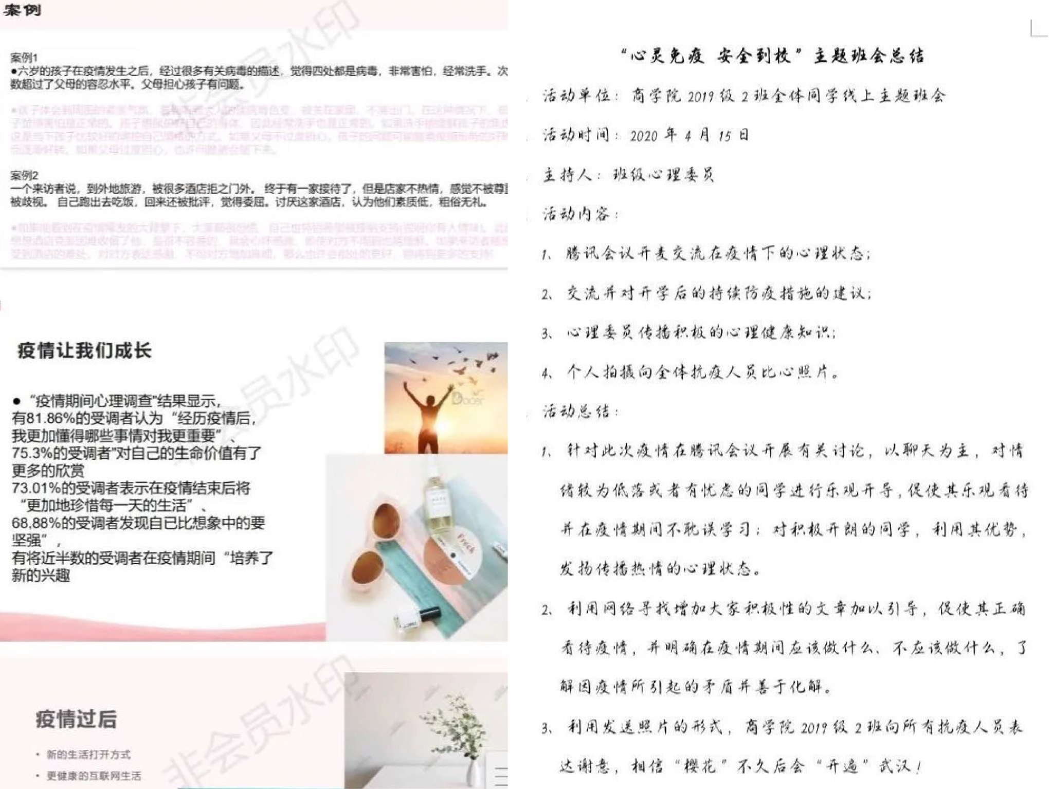 本次“心灵免疫 安全防范”主题班会,促进了学生自觉维护自身身心健康、建立自信,增强心理素质和抗压能力,营造了关注心理健康、互帮互助的氛围,对于提高疫情期间学生心理健康状态,培养良好的心理品质产生了积极影响。