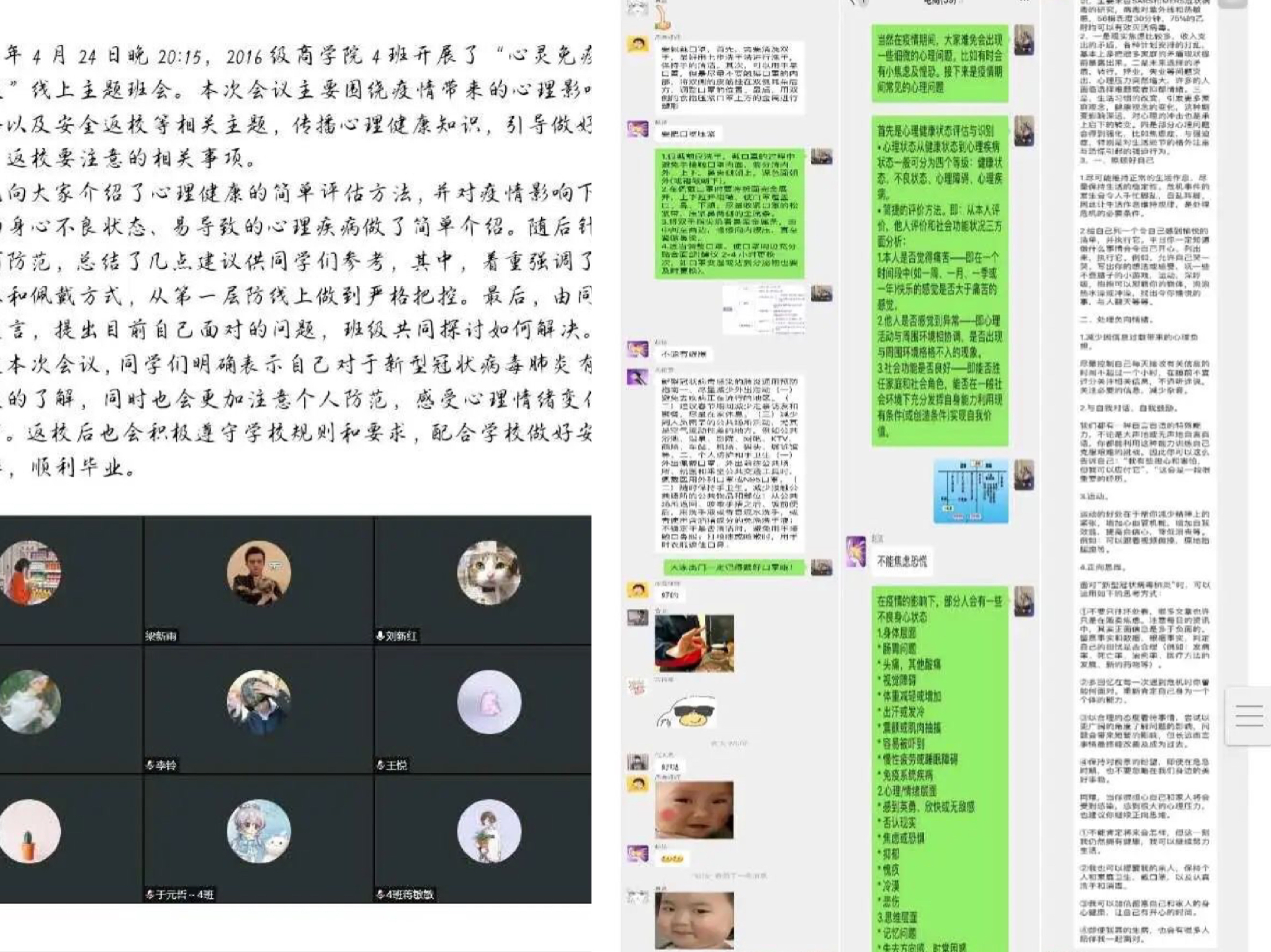 本次班会通过腾讯会议、微信群等多种形式开展,通过PPT讲解、视频播放、疫情期间心理压力舒缓方式分享等方式,班会内容涵盖学生常见心理问题、心理健康的判断标准、解决办法、人生价值取向指引等多个方面。同学们畅所欲言,热烈讨论,在线相互分享调节情绪的不同方式。