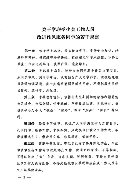 第五条营造平等氛围。牢记自己的首要身份是学生,牢记学联学生会工作的本质是群众工作,彼此互相帮助、平等相待。不得以学生“官”自居,追求头衔、装腔作势,不得向同学指派与工作无关的任务,不得未经批准以学联学生会及工作人员名义开展其他业务。