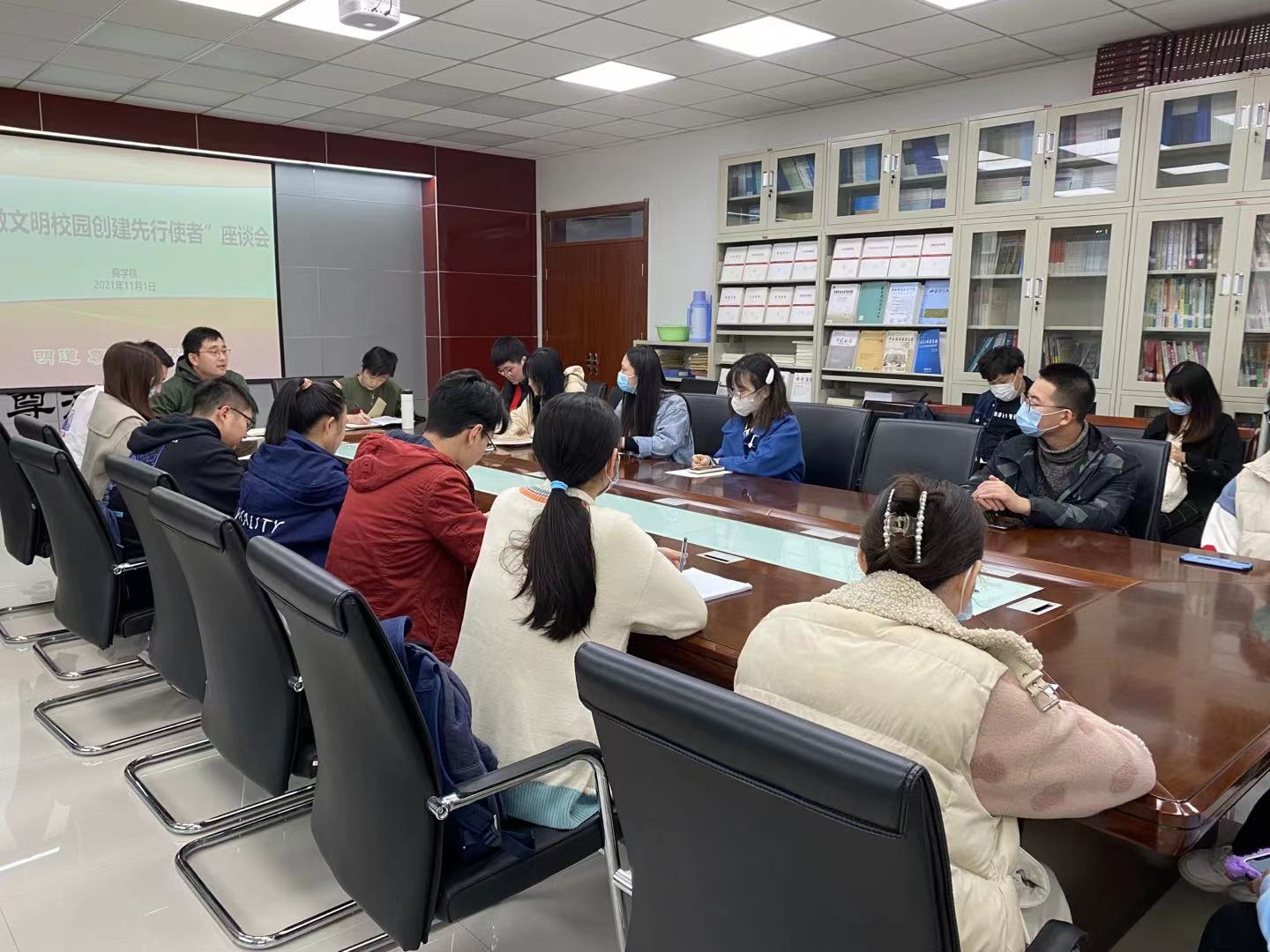 11月1日,禁漫岛 召开“争做文明校园创建先行使者”主题座谈会。学院党委副书记蔺媛及各年级本科生、研究生学生代表出席座谈会。会议由学院团委书记周迪主持。