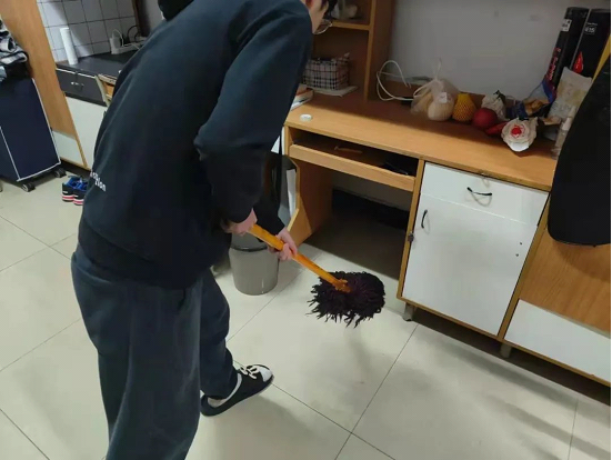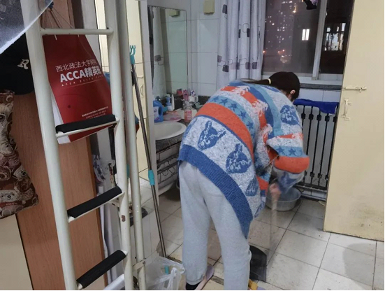 在宿舍清扫活动中,各宿舍舍长安排具体工作,同学们分工明确、各司其职,从地面到每一个死角,同学们都认真仔细地打扫。