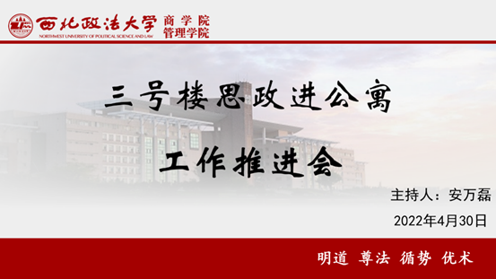为深入贯彻落实文件精神,提高思想政治教育工作实效,4月30日,三号宿舍楼委员会召开三号楼思政进公寓工作推进会,研究生助教孙庆媛、思想政治教育进公寓工作站务委员会成员参加本次会议,会议由安万磊老师主持。