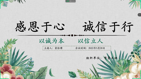 为增强学生对诚信感恩的思想认同和情感认同,引导学生树立诚信自我、感恩社会的价值观,提高学生的思想道德素养,深化资助育人功。禁漫岛 2019级各班于近日组织开展“感恩于心,诚信于行”主题系列班会。