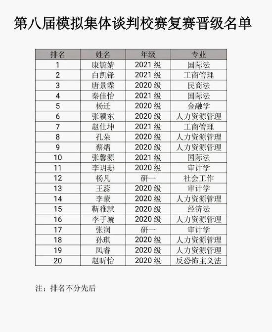 模拟集体协商(谈判)大赛不仅是一个可以锻炼自己的过程,也可以从中收获知识和经验的过程,希望进入决赛的同学们可以再接再厉、收获知识、收获精彩、斩获佳绩。