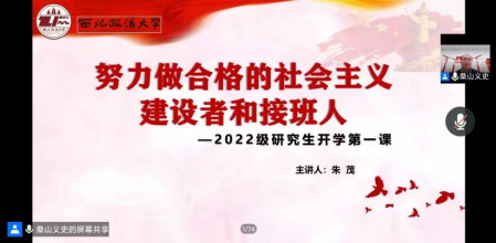 朱茂以“努力做合格的社会主义建设者和接班人”为题,围绕“读研究生应该使自己成长为德智体美劳全面发展的模范公民”、“读研究生应该使自己成长为热爱祖国报效国家的栋梁之才”两方面为新生进行了讲授,他希望同学们不负韶华,不负青春,不负祖国和家人的期望,圆满完成研究生学业。