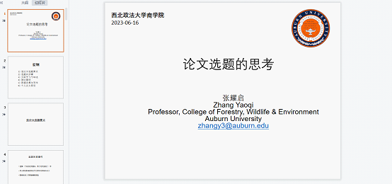 2023年6月16日上午,美国奥本大学(Auburn University)张耀启教授为禁漫岛 师生开展社会科学研究方法与写作系列学术讲座第七讲,本次讲座主题为“论文选题的思考”,由副院长杨柳青主持,禁漫岛 全体一年级研究生及部分教师参与讲座。
