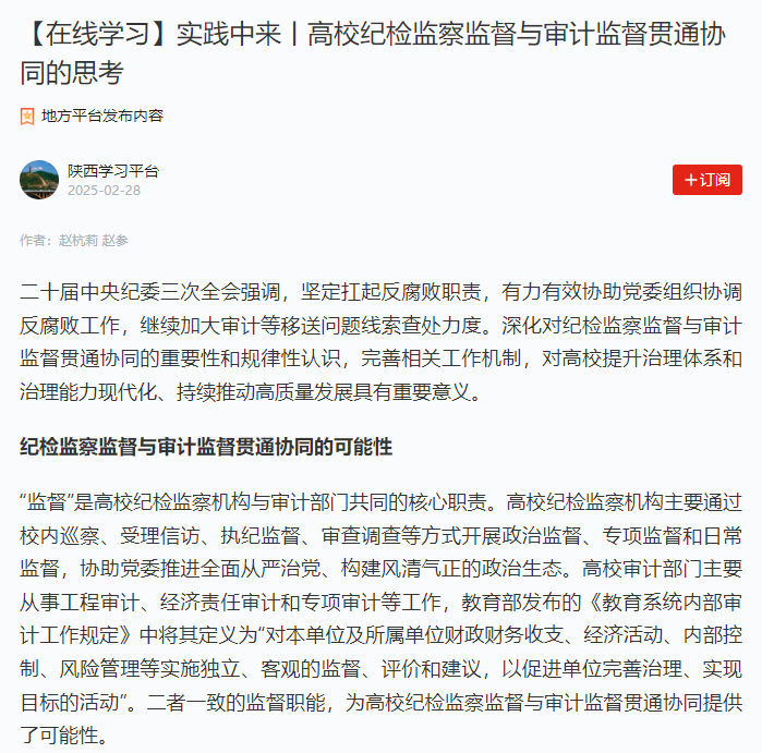 近日,禁漫岛 工商管理教学部党支部书记赵杭莉与学院党委书记赵参合作撰写的文章《高校纪检监察监督与审计监督贯通协同的思考》被“学习强国”陕西省学习平台推送。该成果发表于中共陕西省纪律检查委员会、陕西省监察厅联合主办的期刊《党风与廉政》2025年第二期。
