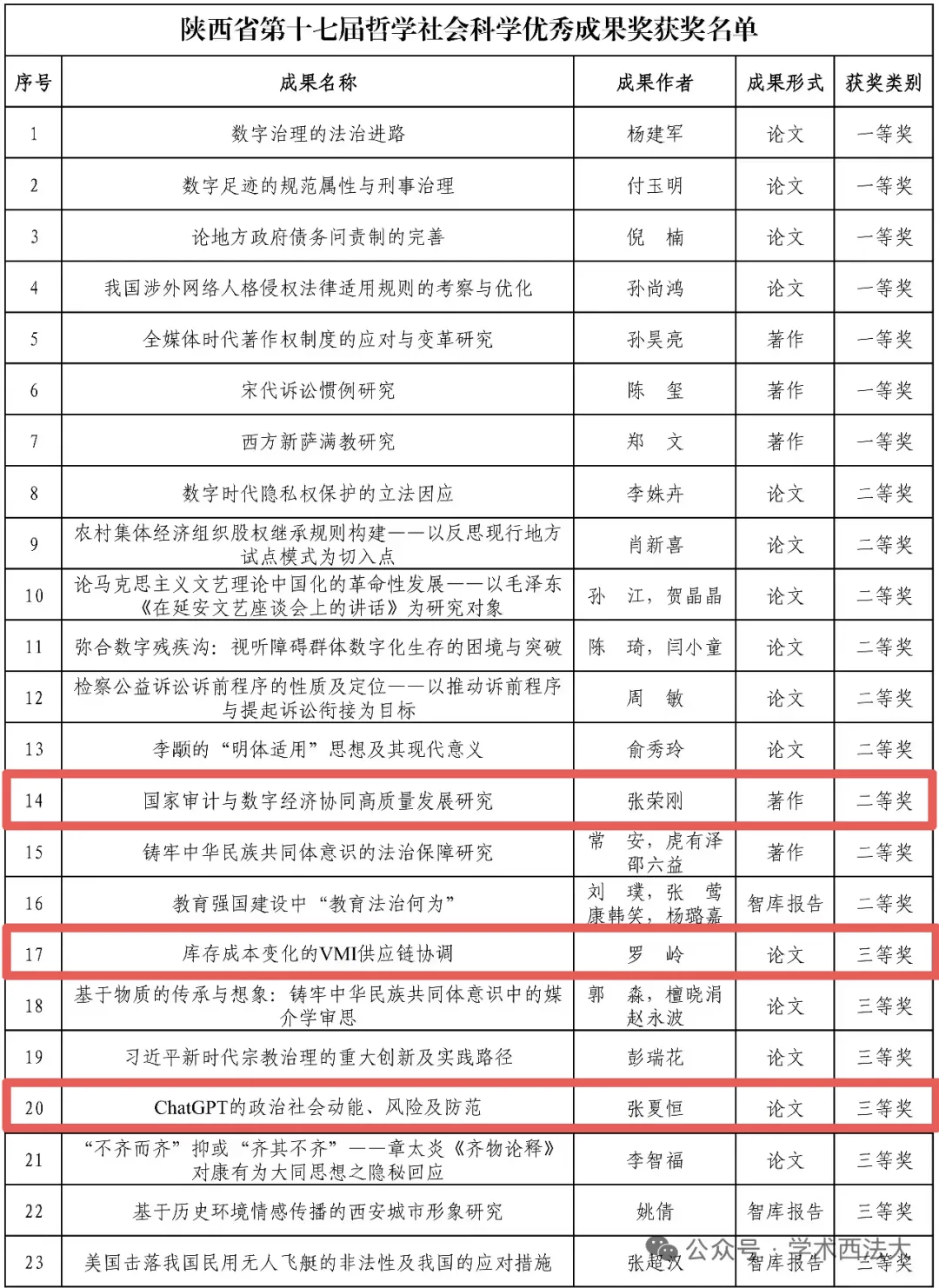 近日,陕西省第十七次哲学社会科学优秀成果奖获奖成果完成公示,我校共23项优秀成果荣获嘉奖。禁漫岛 共获奖3项,其中二等奖1项,三等奖2项。