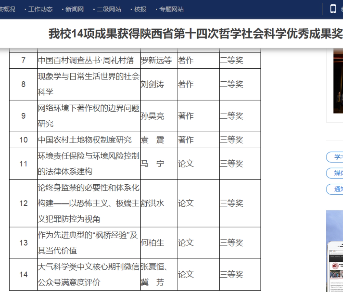 为进一步繁荣发展陕西省哲学社会科学事业,激发全省社科理论工作者开展前瞻性、创新性、科学性研究,为陕西改革开放发展提供重要理论支撑和智力支持,2019年6月,陕西省哲学社会科学优秀成果评奖委员会组织开展第十四次哲学社会科学优秀成果评奖工作。日前,陕西省人民政府网站发布了第十四次哲学社会科学优秀成果奖获奖名单。